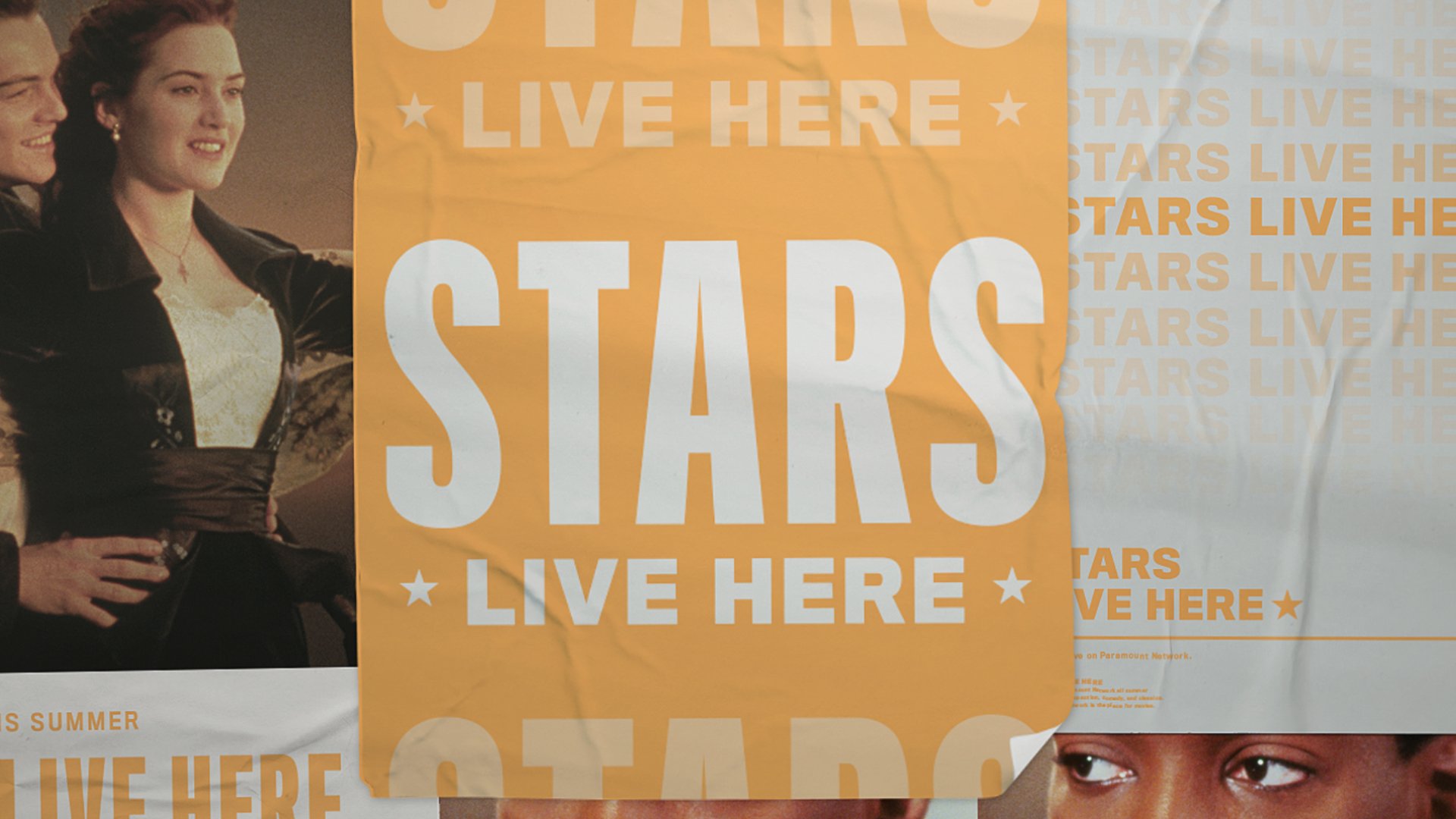 Inspired by a love for movie posters and typography, we built a sophisticated design system that combined these elements together into a ‘wild posting’ style graphics package. Graphics for Movies Live Here are color-coded by movie genre or theme: blue for Movies, red for Action, gold for Stars, yellow for Comedy, and purple for Classics. The posters are simple by design, utilizing basic shapes and type to evoke symbols of film, like movie tickets, filmstrips, spotlights, and more.